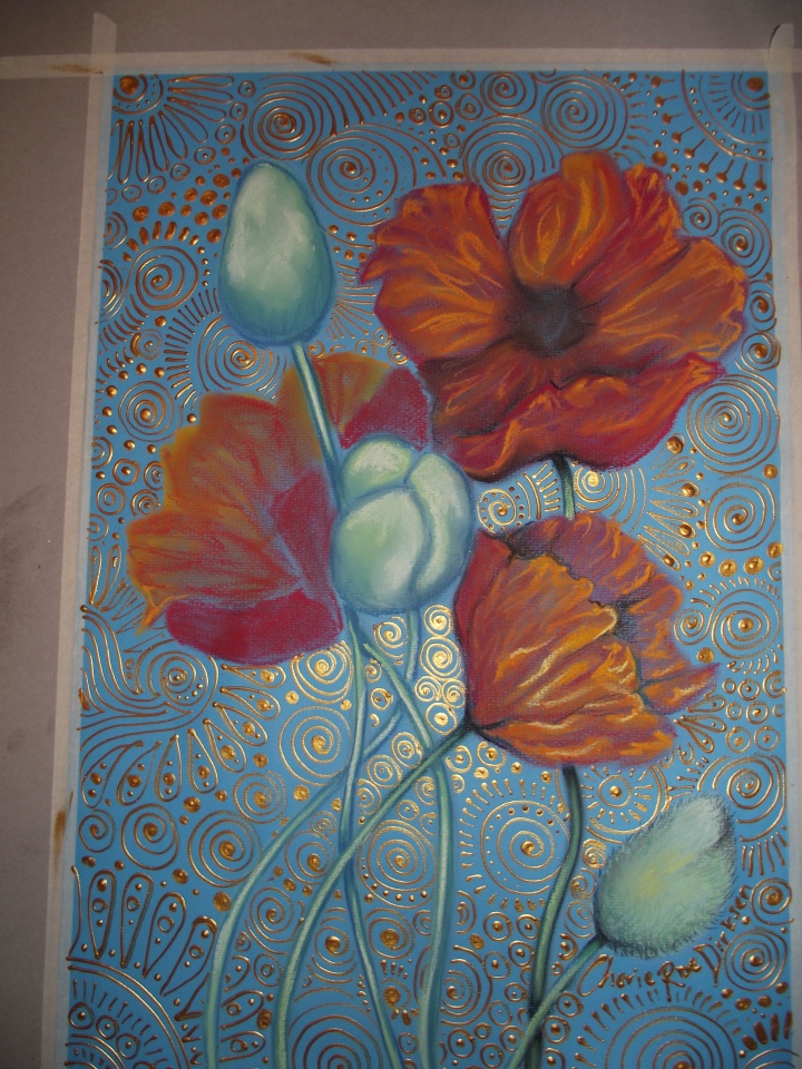 I haven’t done a ‘fly on the wall’ blog for ages, so I thought I’d show you the creative process behind my pastel poppy artwork called, ‘Orange Poppies on Blue’. Yeah, I know…really original title. Named so because:
