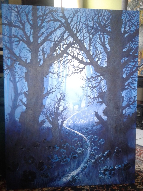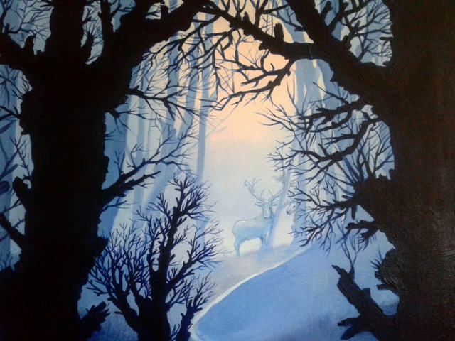 The background received a yellow ‘wash’ of paint to make it appear a little blurred and the trees were executed in a sharp manner (I used permanent ink for the smaller branches) to render the forest more in focus.