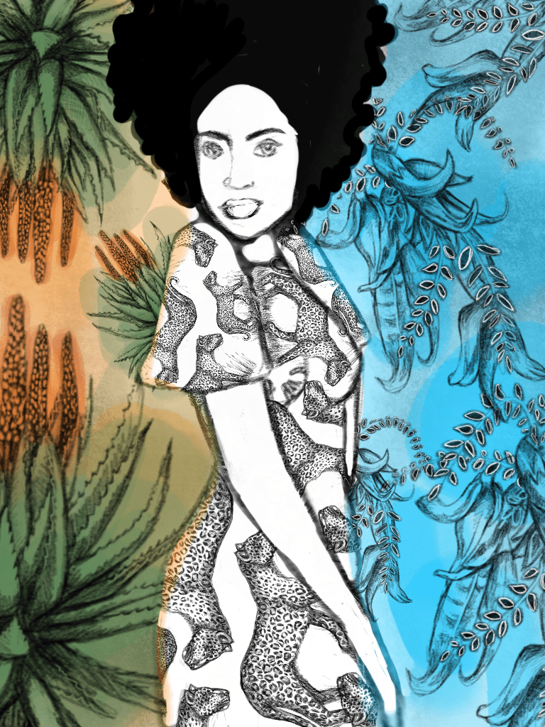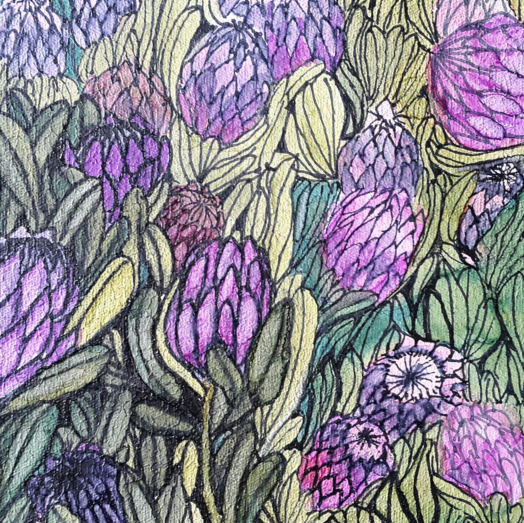They have like a watercolour/silkscreen effect. Below is my first attempt, I started off outlining in black then colouring in but that made the colours blend with the black (you can tell I’m a novice, right?) and produced a muddy effect. So, I then did the background colour first and went on to outline the proteas and foliage in black.