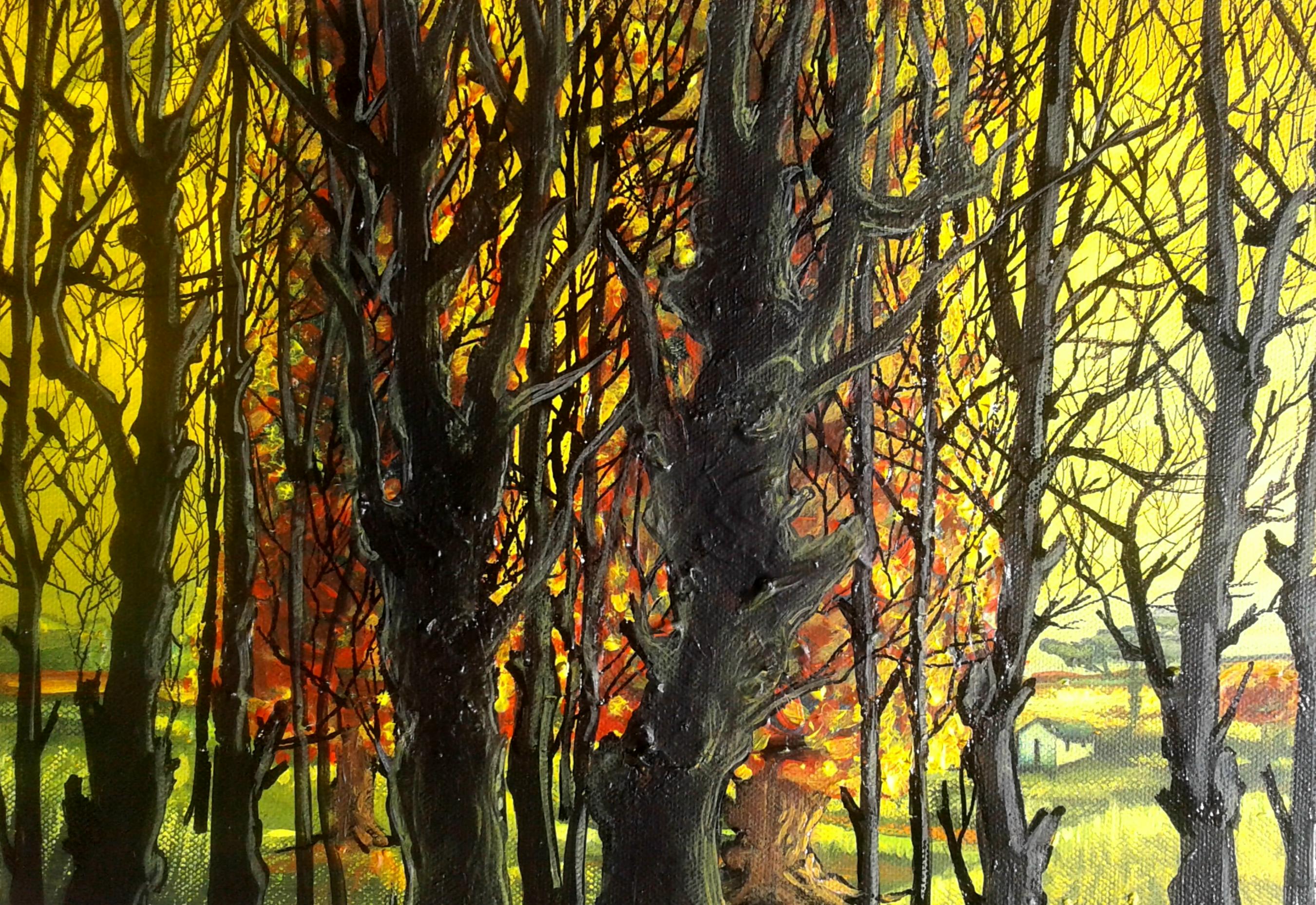 The background received a yellow ‘wash’ of paint to make it appear a little blurred and the trees were executed in a sharp manner (I used permanent ink for the smaller branches) to render the forest more in focus.