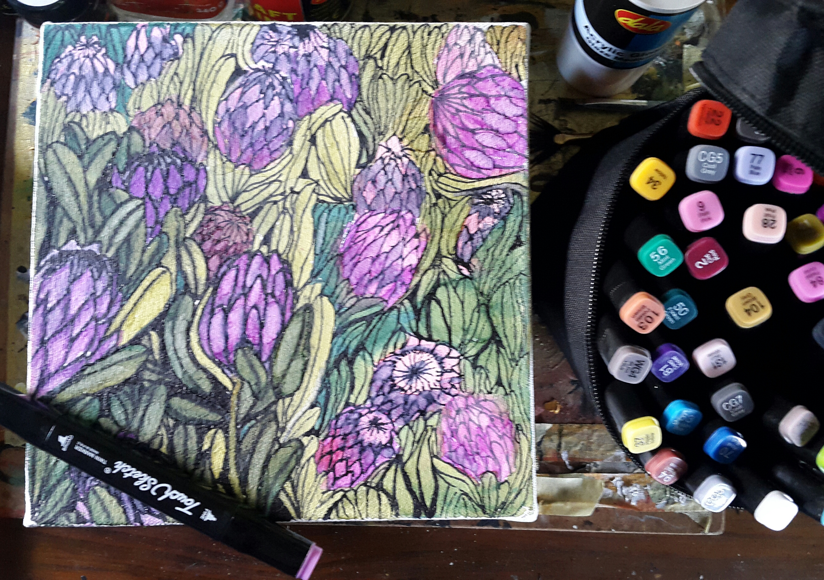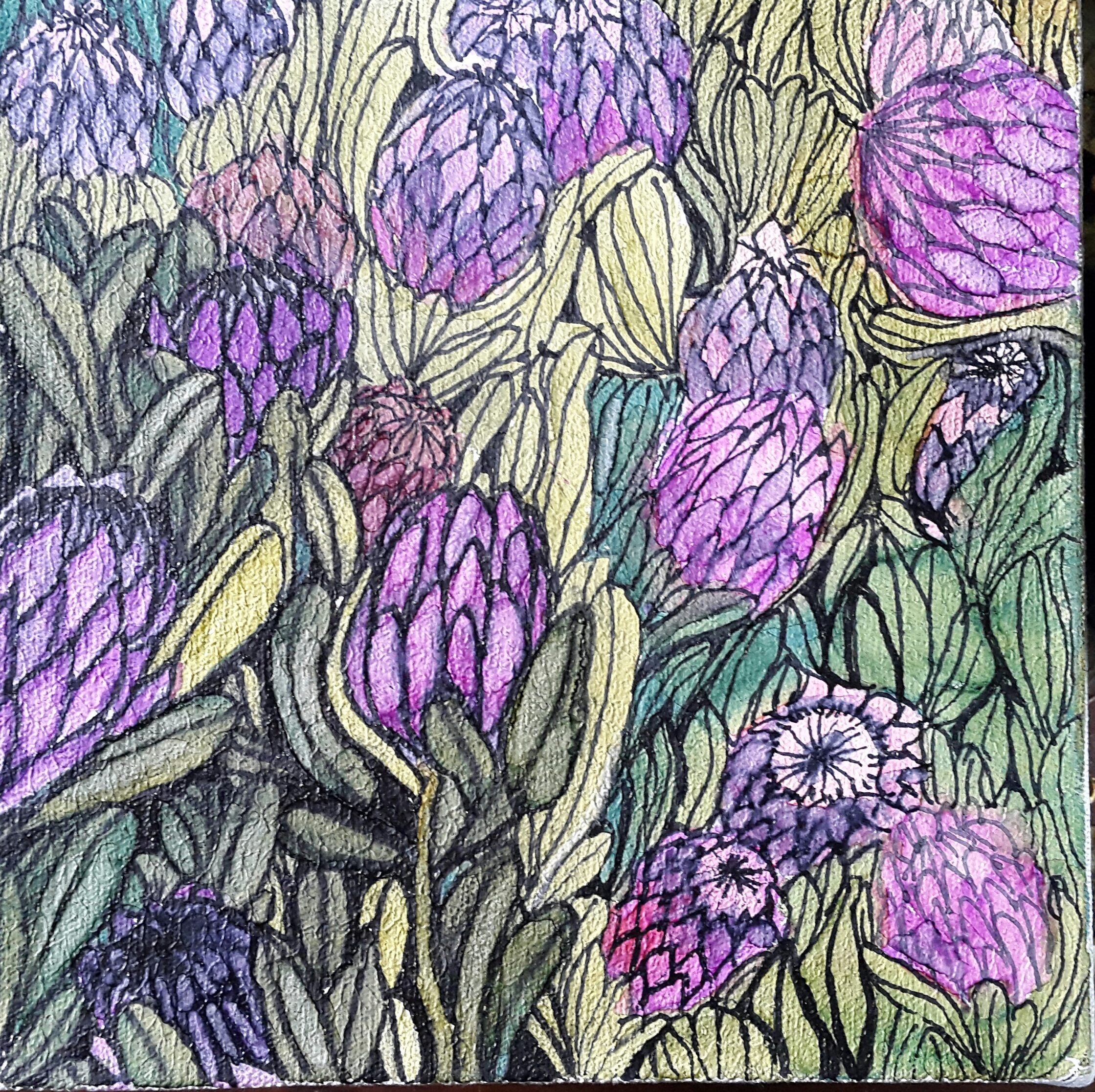 They have like a watercolour/silkscreen effect. Below is my first attempt, I started off outlining in black then colouring in but that made the colours blend with the black (you can tell I’m a novice, right?) and produced a muddy effect. So, I then did the background colour first and went on to outline the proteas and foliage in black.