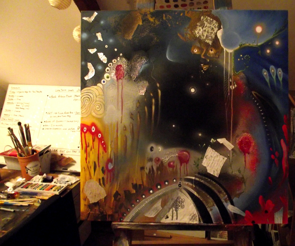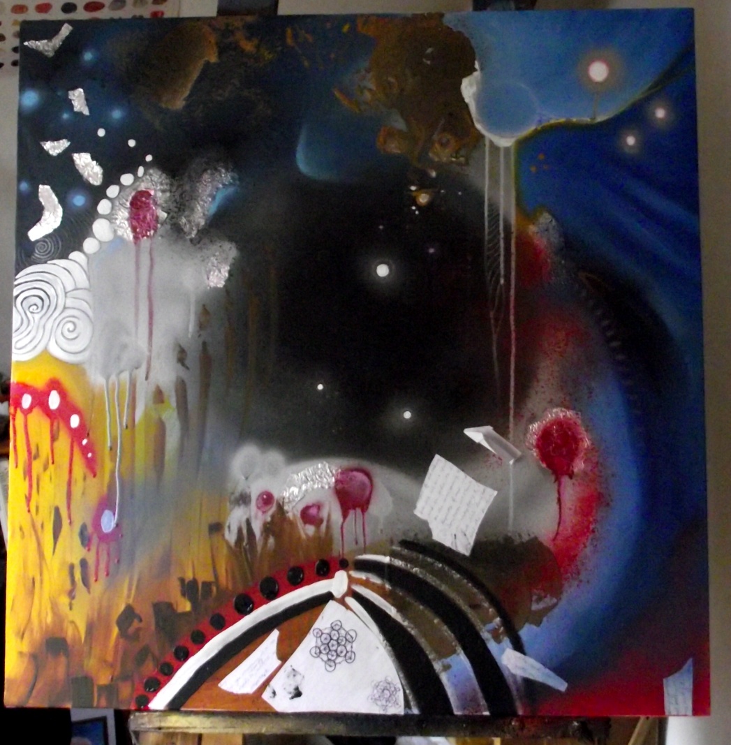 It began with me spray painting the black hole in the center which represented a void. Emotions getting sucked into a black hole.