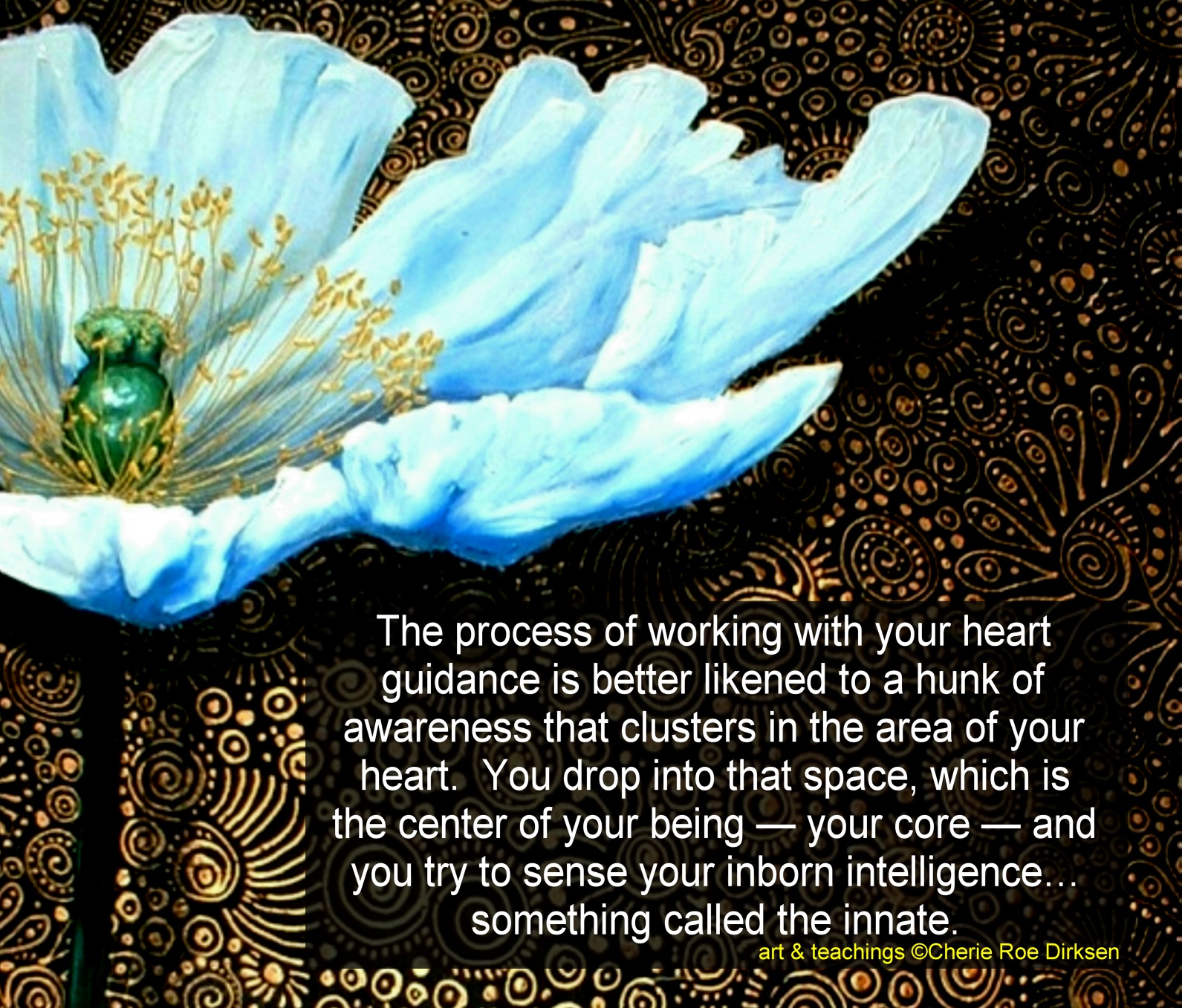The process of working with your heart guidance is better likened to a hunk of awareness that clusters in the area of your heart.  You drop into that space, which is the center of your being — your core — and you try to sense your inborn intelligence…something called the innate.