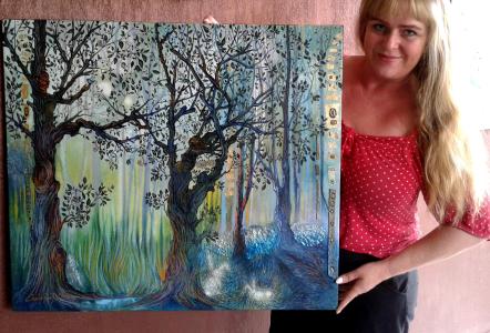 The background received a yellow ‘wash’ of paint to make it appear a little blurred and the trees were executed in a sharp manner (I used permanent ink for the smaller branches) to render the forest more in focus.